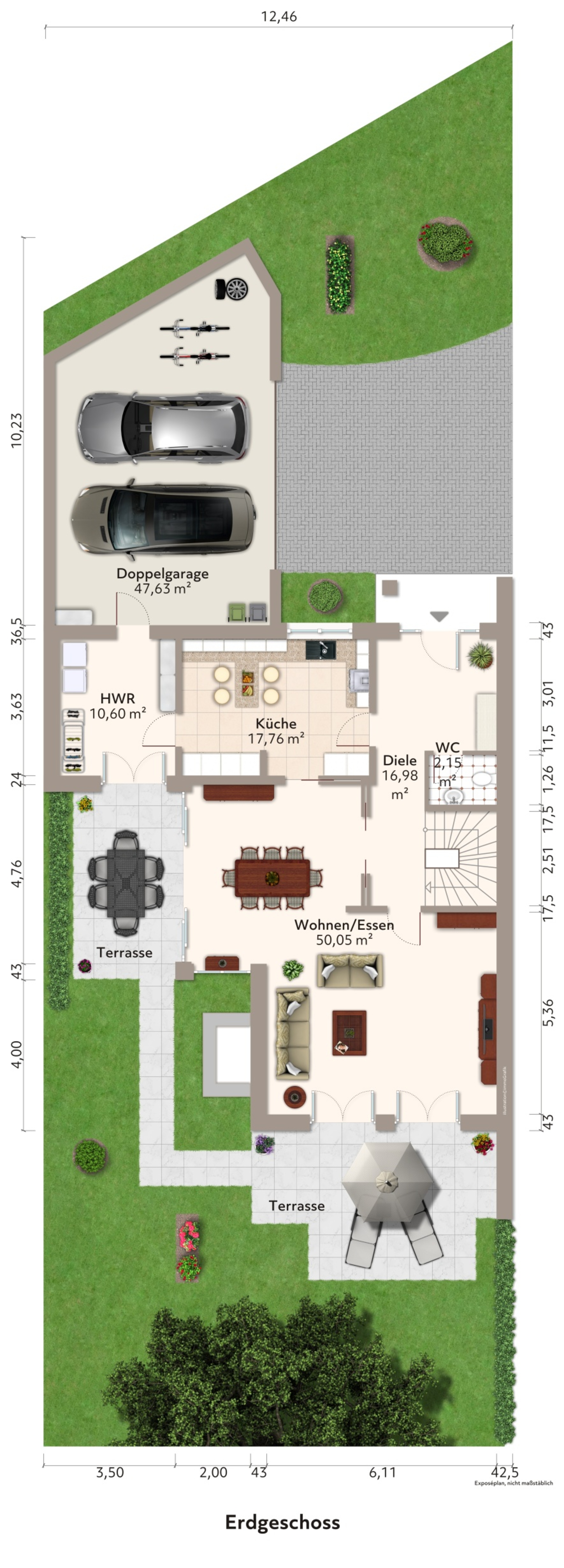 -geräumige, mit elektrisch betriebenem Tor versehene Doppelgarage und direktem Zugang zum Haus
