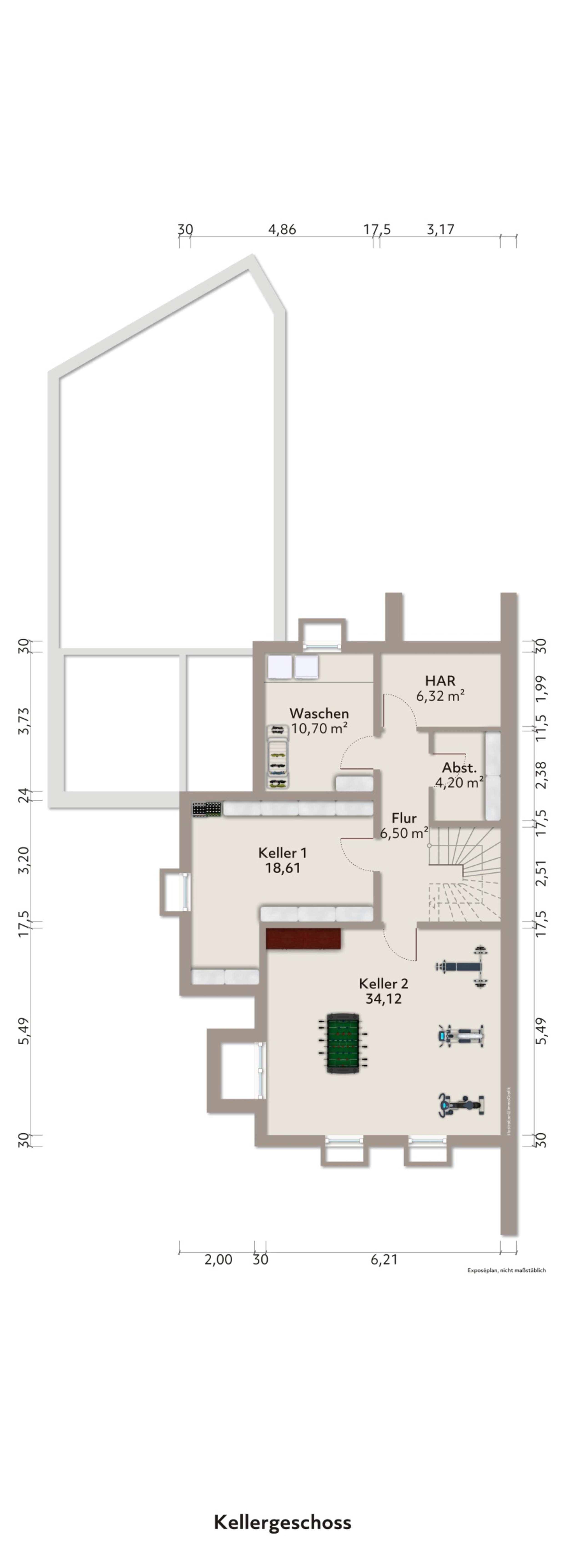 Das wohnlich gestaltete, durchgehend beheizte Untergeschoss hält zusätzliche Nutzungsmöglichkeiten bereit und offeriert neben dem über 34 m2 messenden und tagesbelichteten Hobbyraum, eine Duschkabine, einen Wasch- und Trockenraum sowie einen Hausanschlussraum.