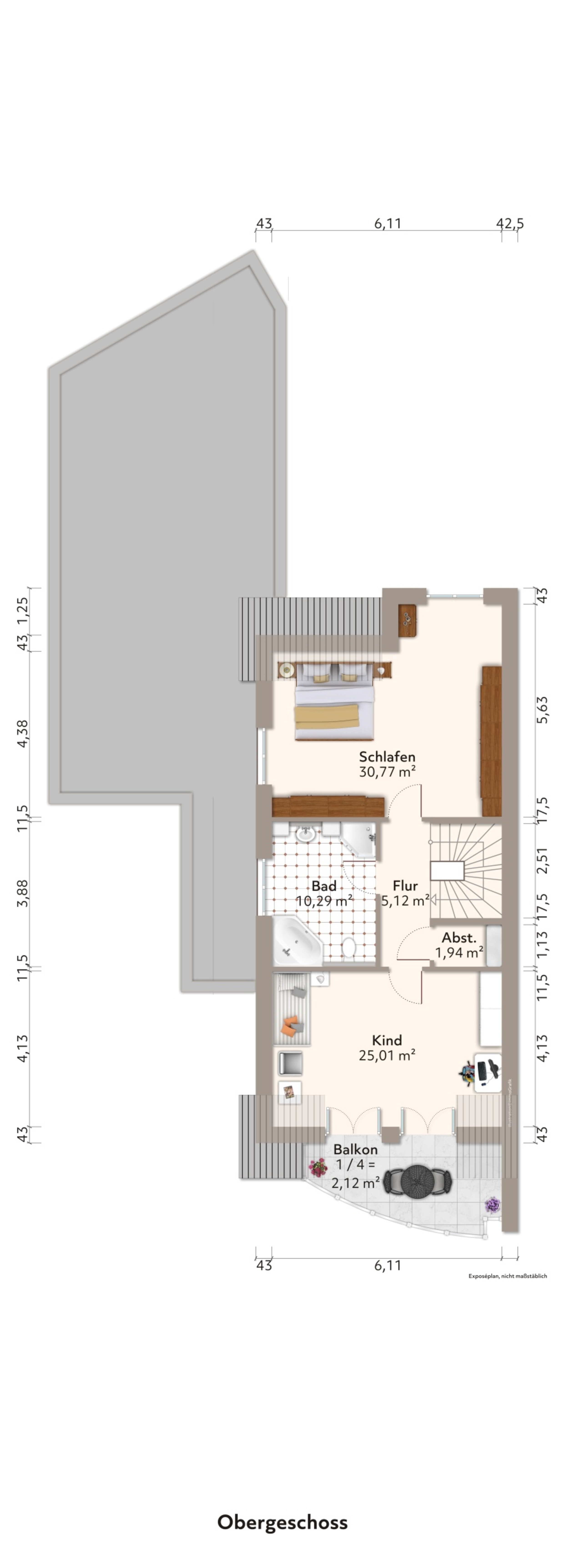 Ein puristischer Treppenaufgang mit massiven Buchenholzstufen und Holzhandlauf führt vom Flur aus ins Obergeschoss. Diese Ebene überrascht mit ihrer gut durchdachten Aufteilung in einen zentralen Flur, zwei gut bemaßte Schlafräume sowie ein Vollbad. Das deckenhoch, hell verflieste Badezimmer ist mit einer Badewanne, einer Duschkabine mit Glasabtrennung, einem Doppelwaschtisch sowie einem Handtuchheizkörper ausgestattet. Das große Fensterelement spendet reichlich Tageslicht und die Fußbodenheizung behagliche Wärme. Ein Highlight dieser Etage ist der viel Platz bietende, formschöne Balkon, der ein herrliches Panorama auf die arrondierende Grundstücksanlage und den angrenzenden Wald freigibt.