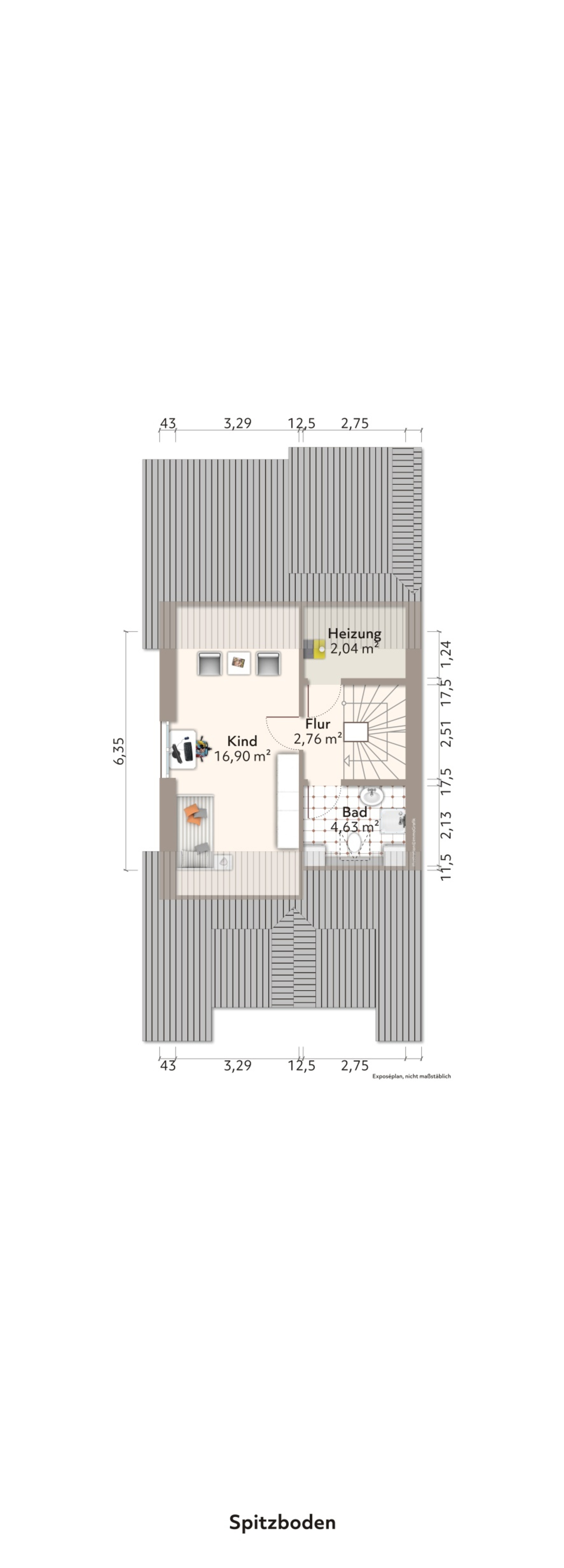 Weiter geht es in das freundlich ausgebaute Dachgeschoss. Diese geräumige und zugleich gemütliche Fläche eignet sich mit zwei Zimmern und einem Duschbad optimal zur Gästeunterbringung oder auch als ungestörter Arbeitsbereich.